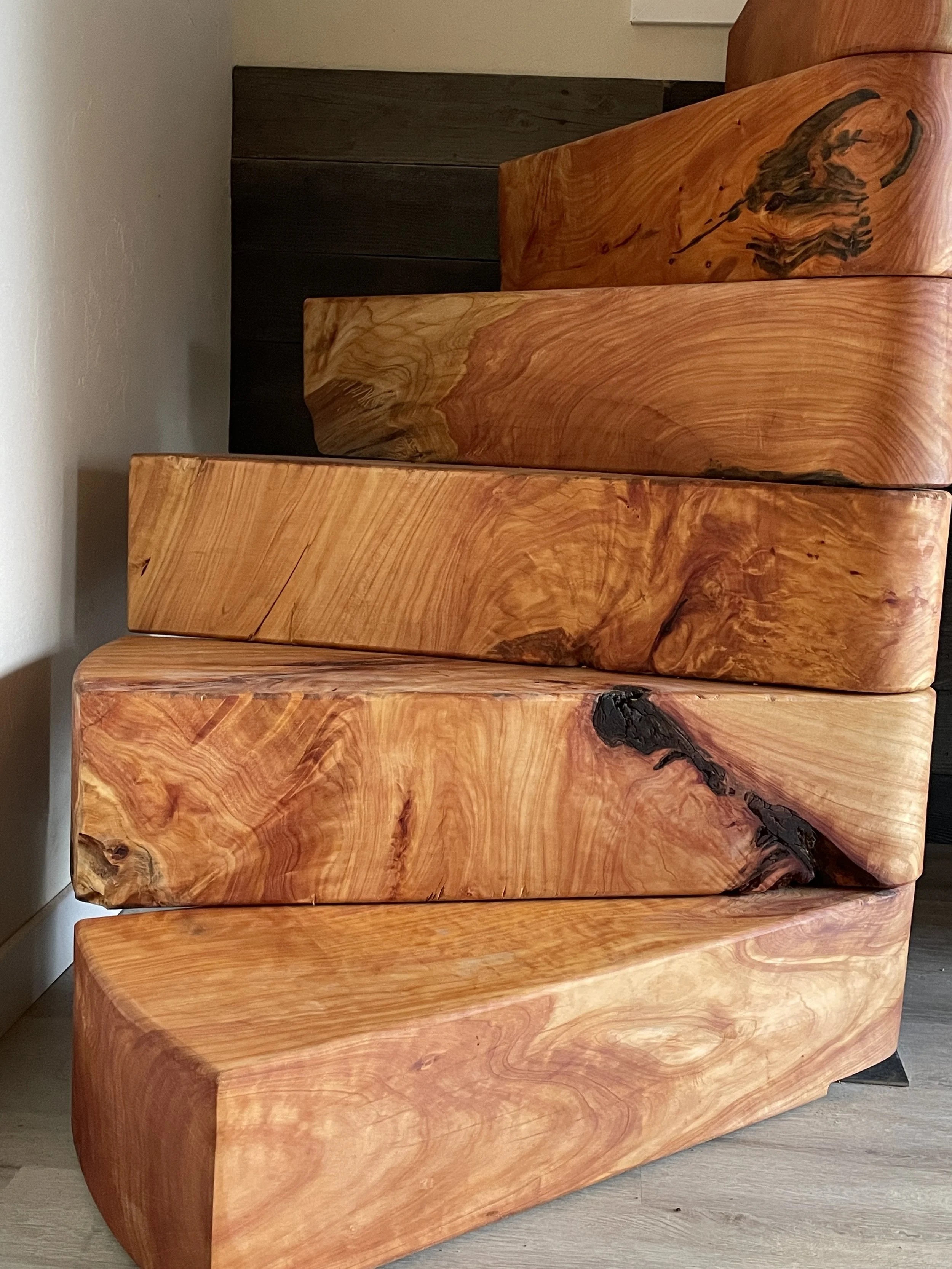 Wood with a Story: We salvaged the Monterey Cypress for this epic project from a local community tree service. Stunning wood that would have otherwise been chipped became a functional piece of art added to a Carmel Valley home. This project provided a complex design challenge that we were able to achieve through highly detailed work using CAD to create a model of the staircase piece by piece, considering how each block and all of the elements fit together to arrive flush between the top and bottom floors of this home. When the last block was lowered into place, the feeling was pure satisfaction, as our planning and hand-crafting of each piece met the moment of installation perfectly.