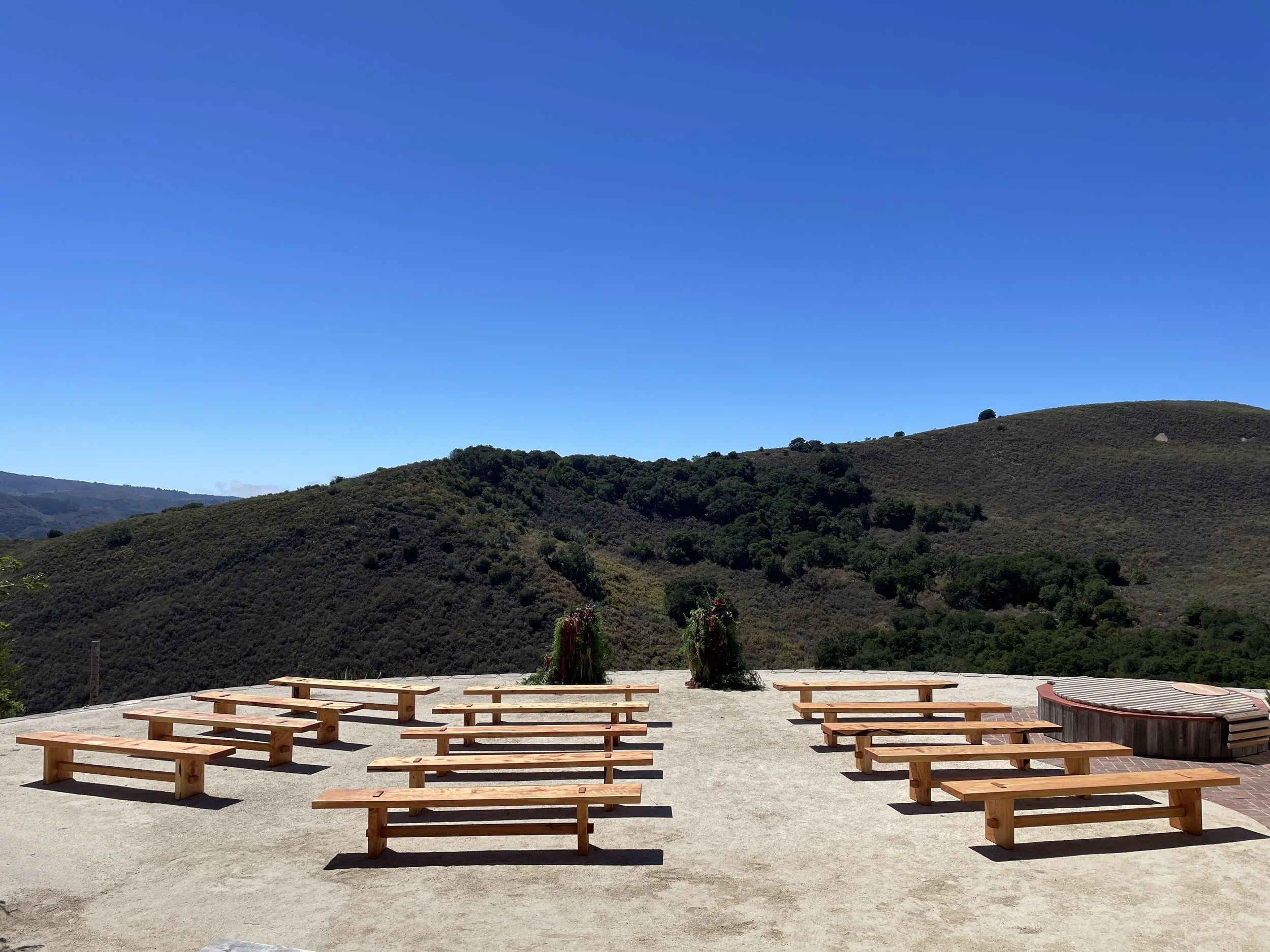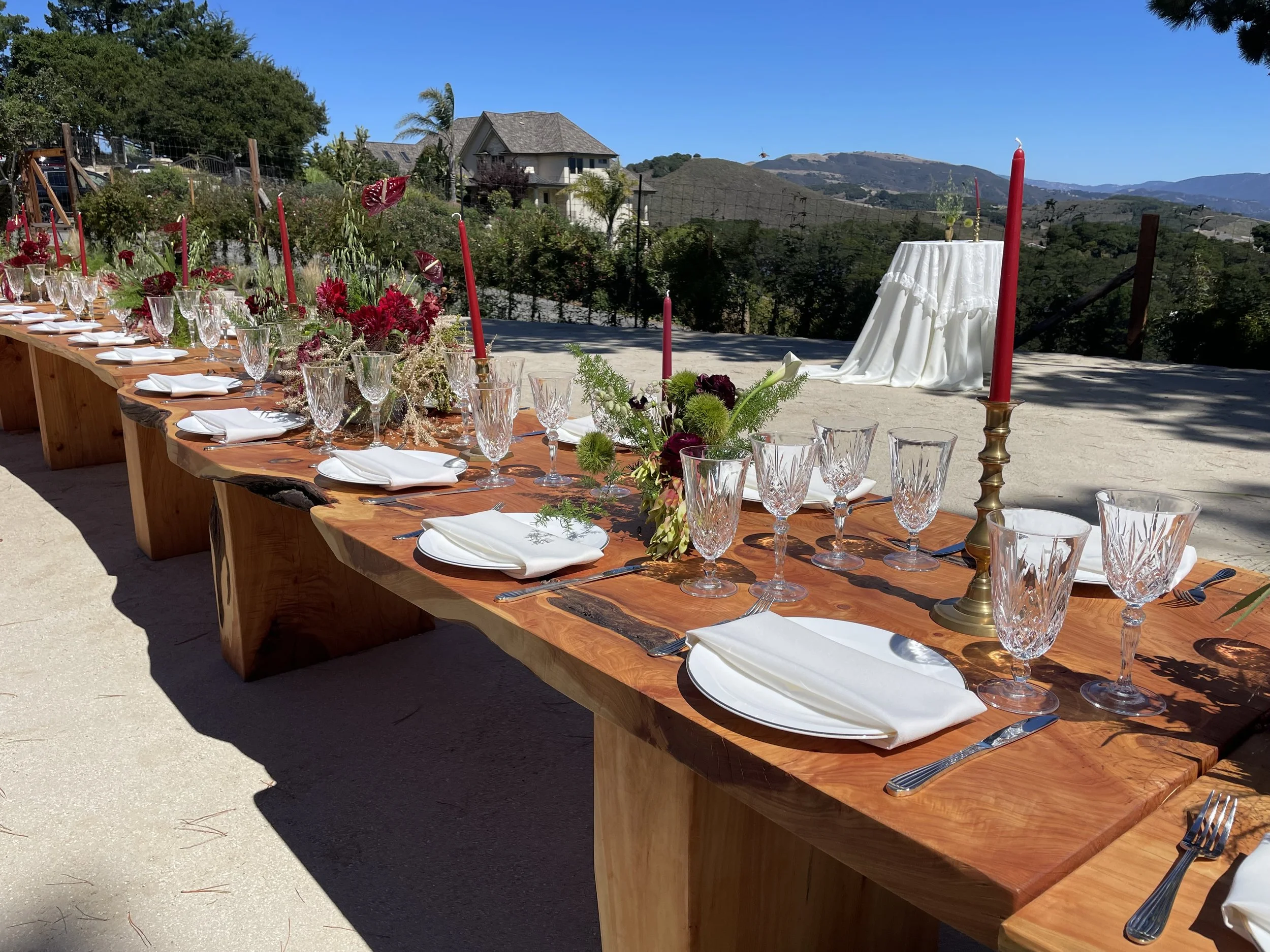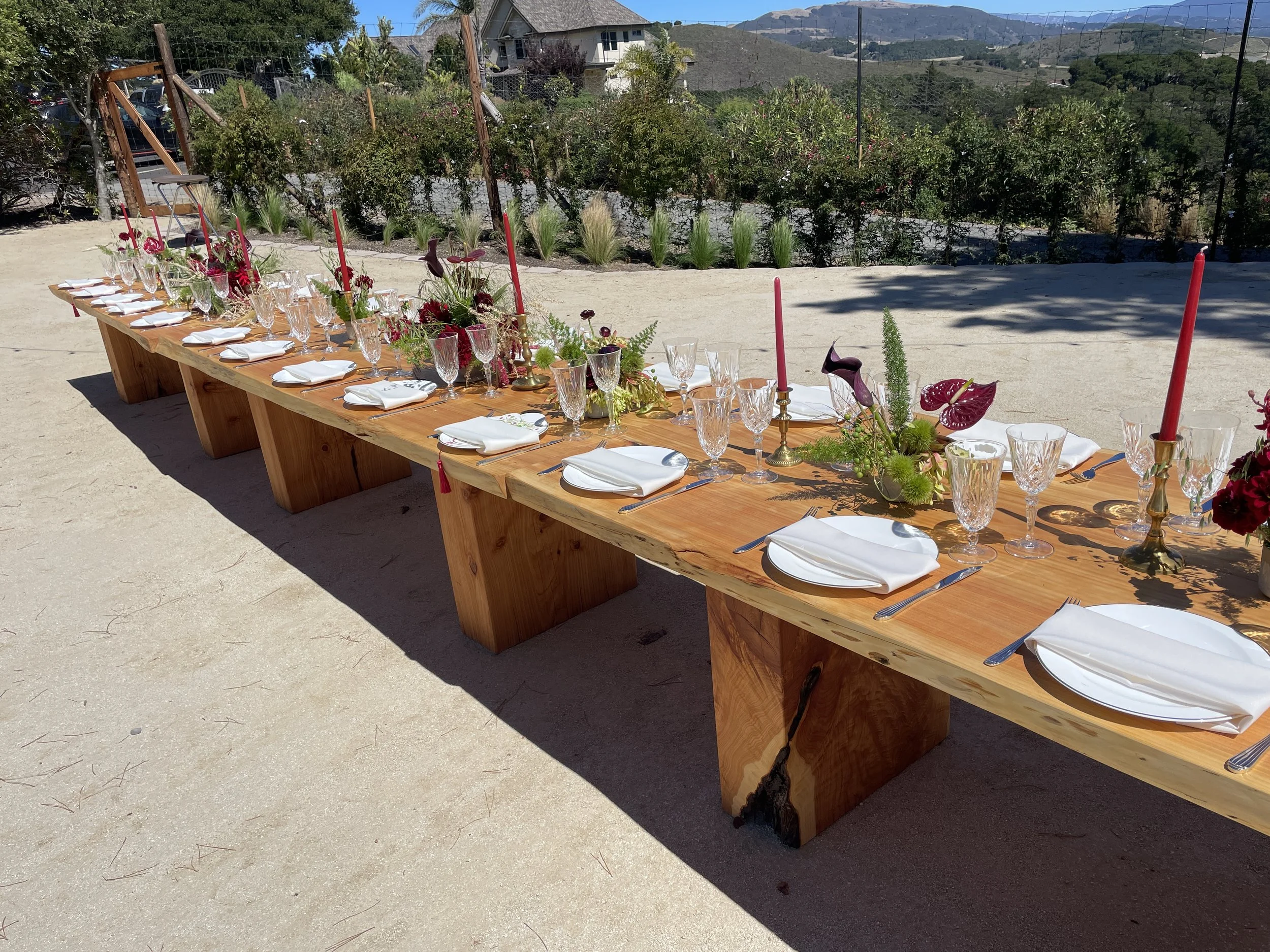 Wood with a Story: To highlight the local beauty of their area at their mountain home wedding, this couple commissioned a set of seven 10’ Dining Tables & Benches to seat their entire guest party at one family-style table. We sourced the Monterey Cypress from a local community tree service, and milled the logs into slabs to create these pieces.