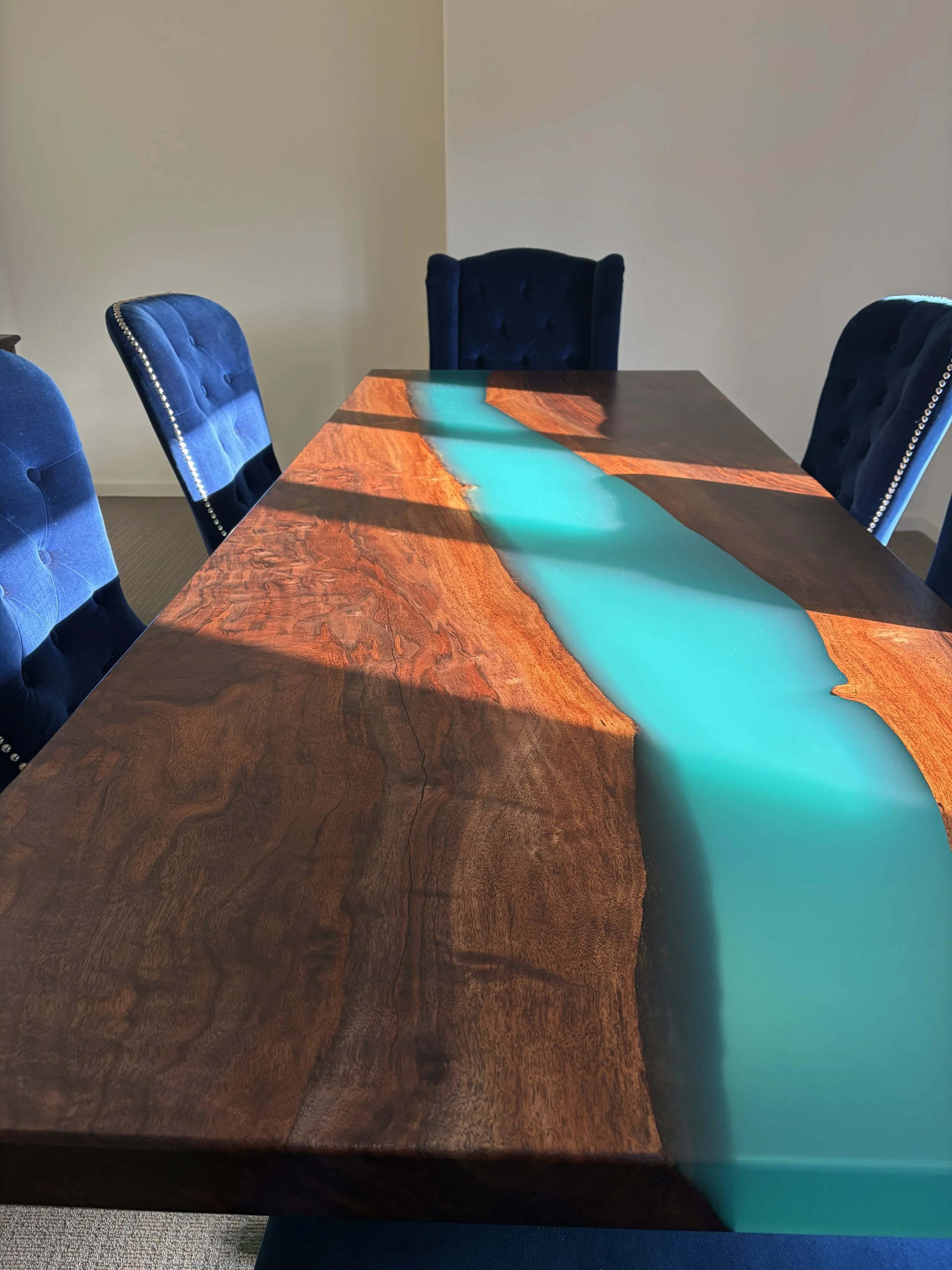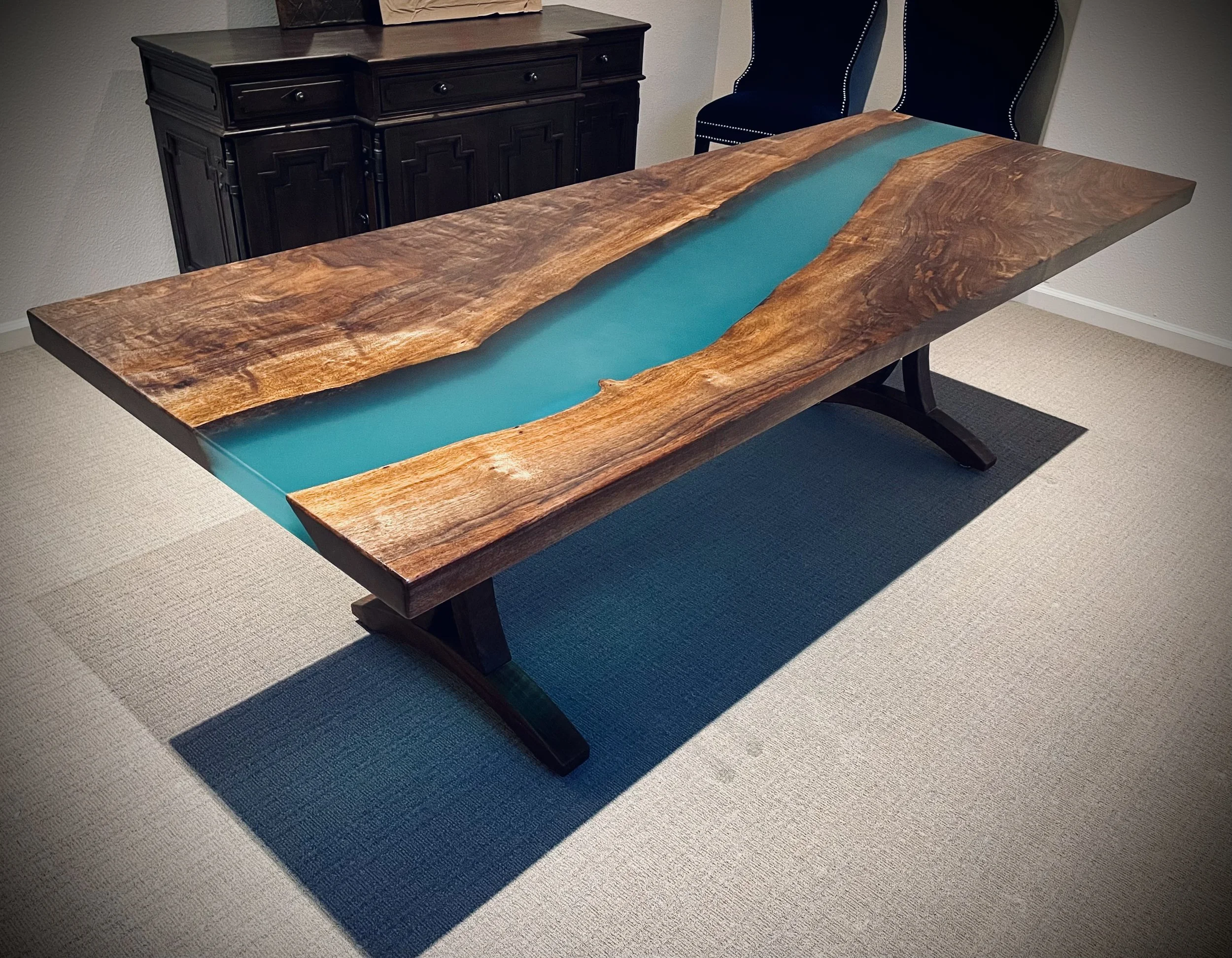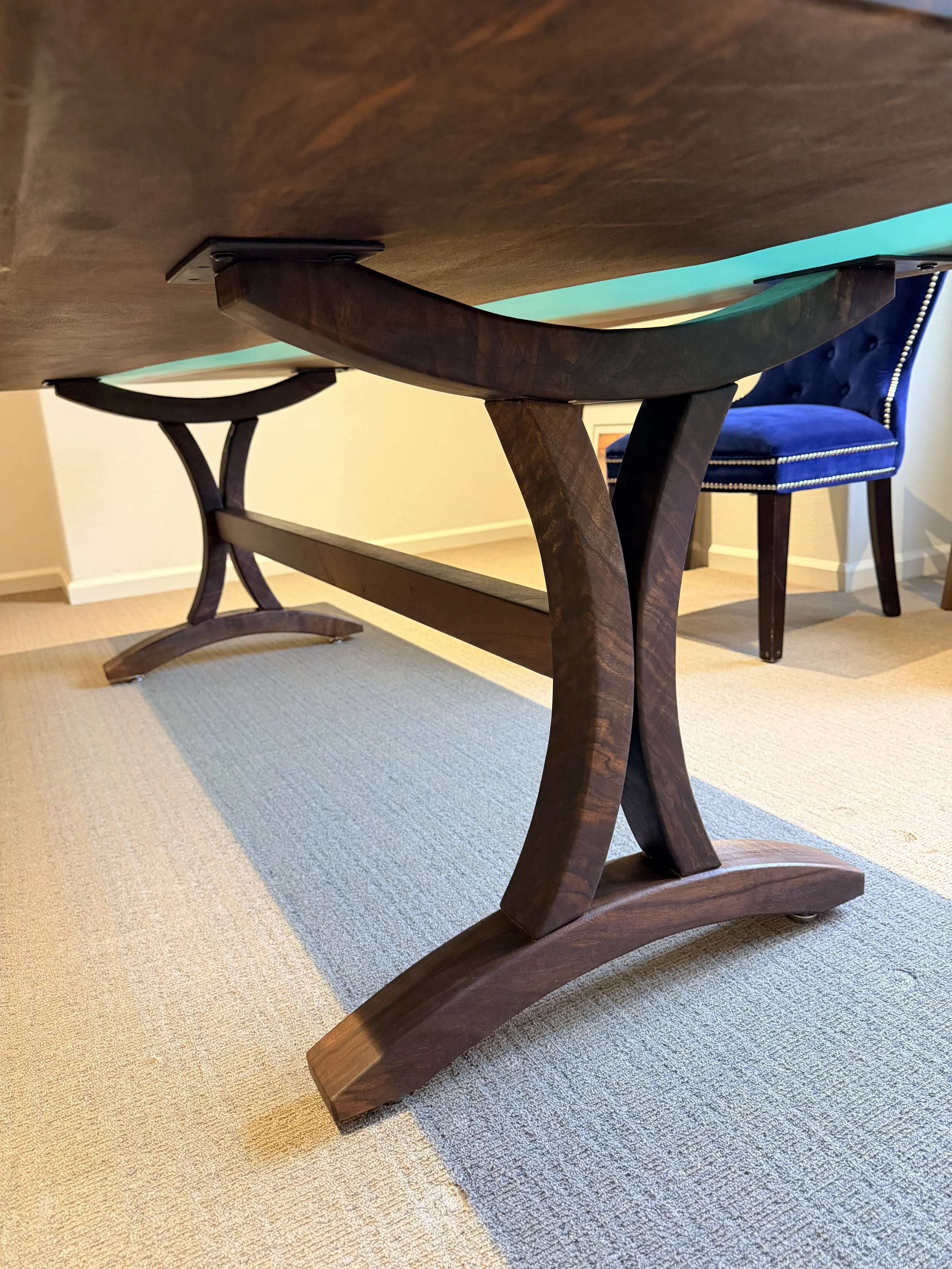We flattened the slab on our slab flattener and cut out the sections we wanted to use, reserving the remainder of the slab for a future project to accent this client’s office to create a cohesive collection. We mixed sample colors for the client to review, poured the epoxy river, and got to work hand-finishing every inch of the piece. We created an original design for the wooden base with elegant curves using walnut wood from the same slab.