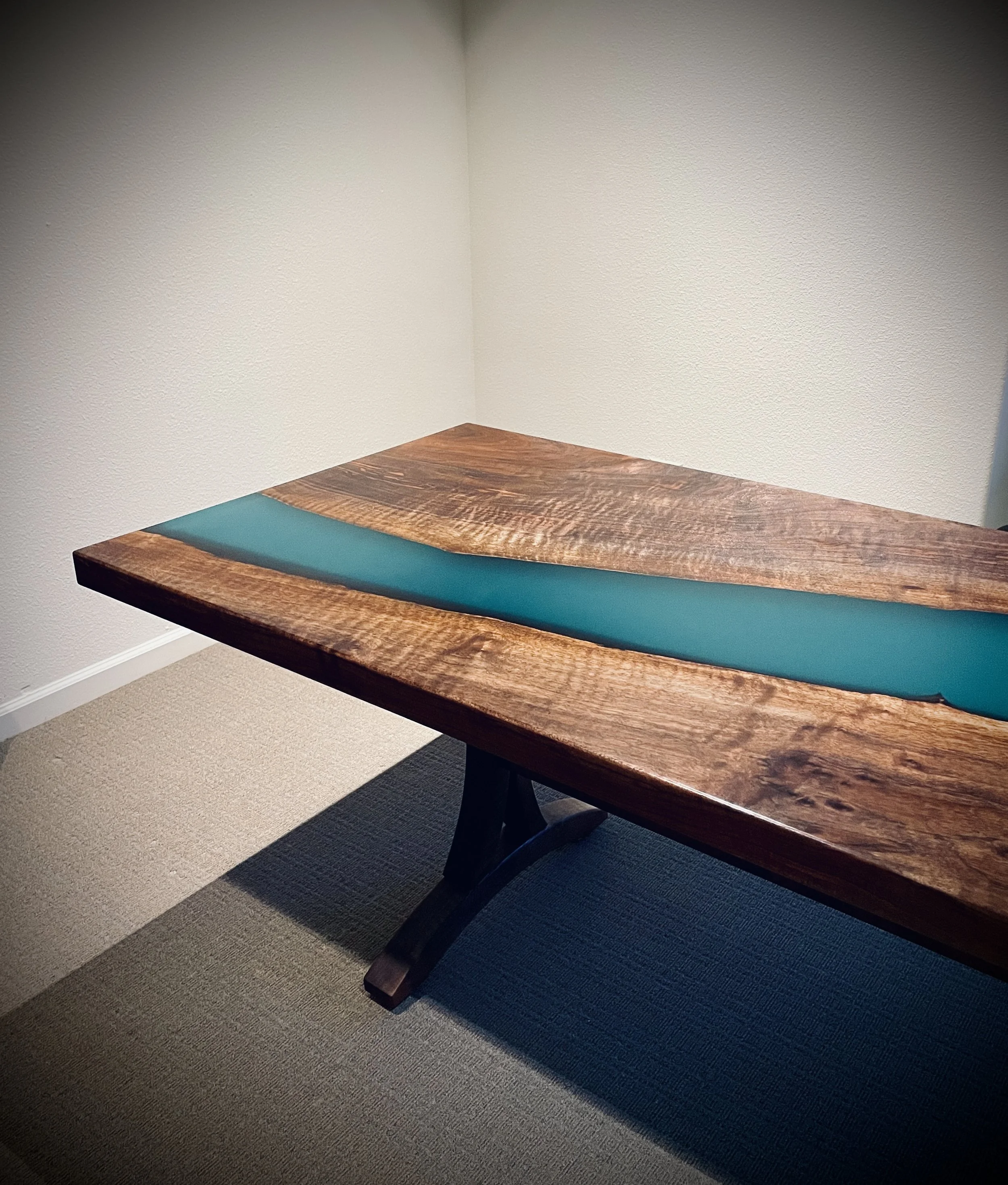 Wood with a Story: We sourced the Oregon Black Walnut for this project from our same favorite mill in Portland, OR — Goby Walnut — and collaborated extensively with the client to select the optimal slab with the best edge curves that could be mirrored to create the “River” concept for her custom epoxy river conference table.