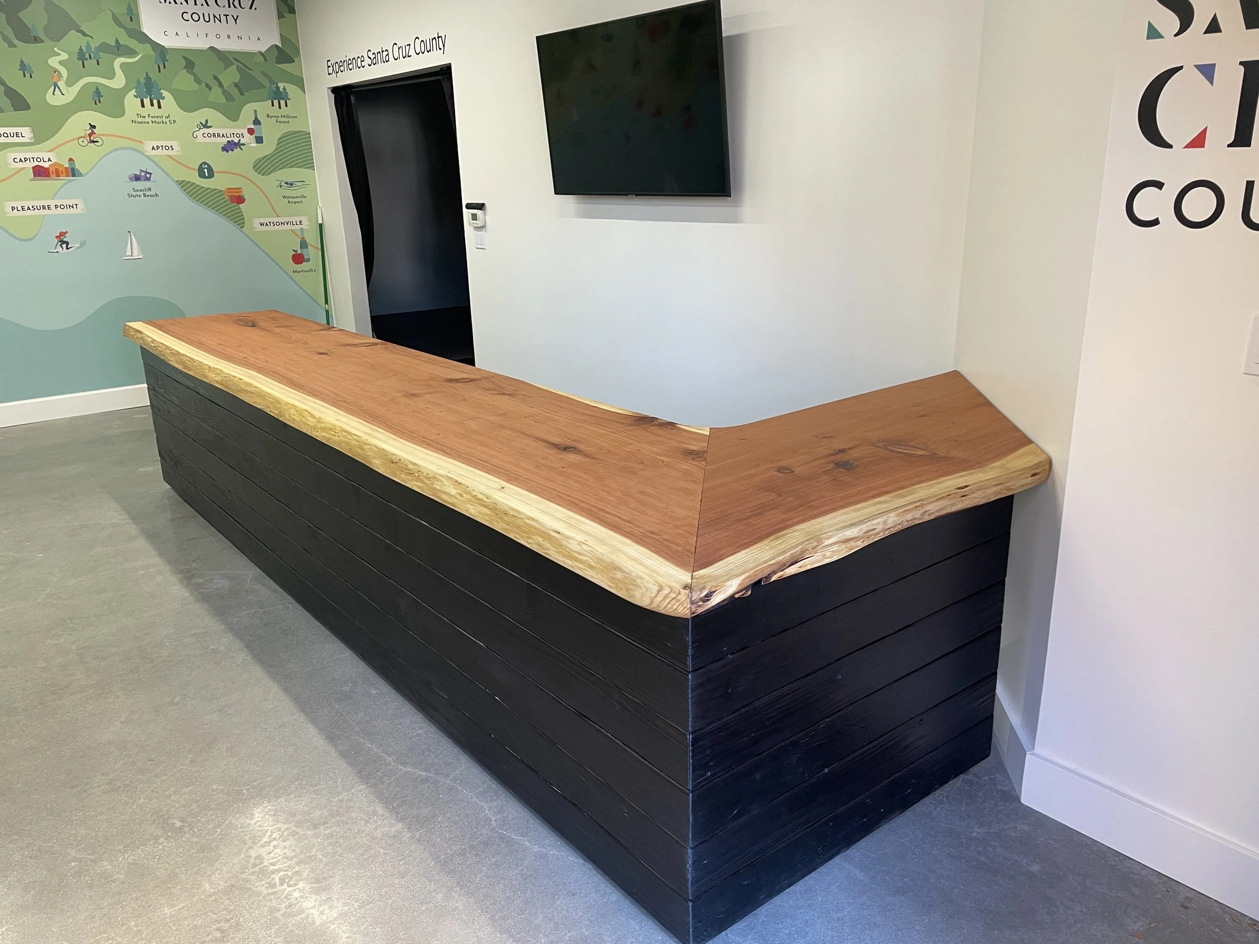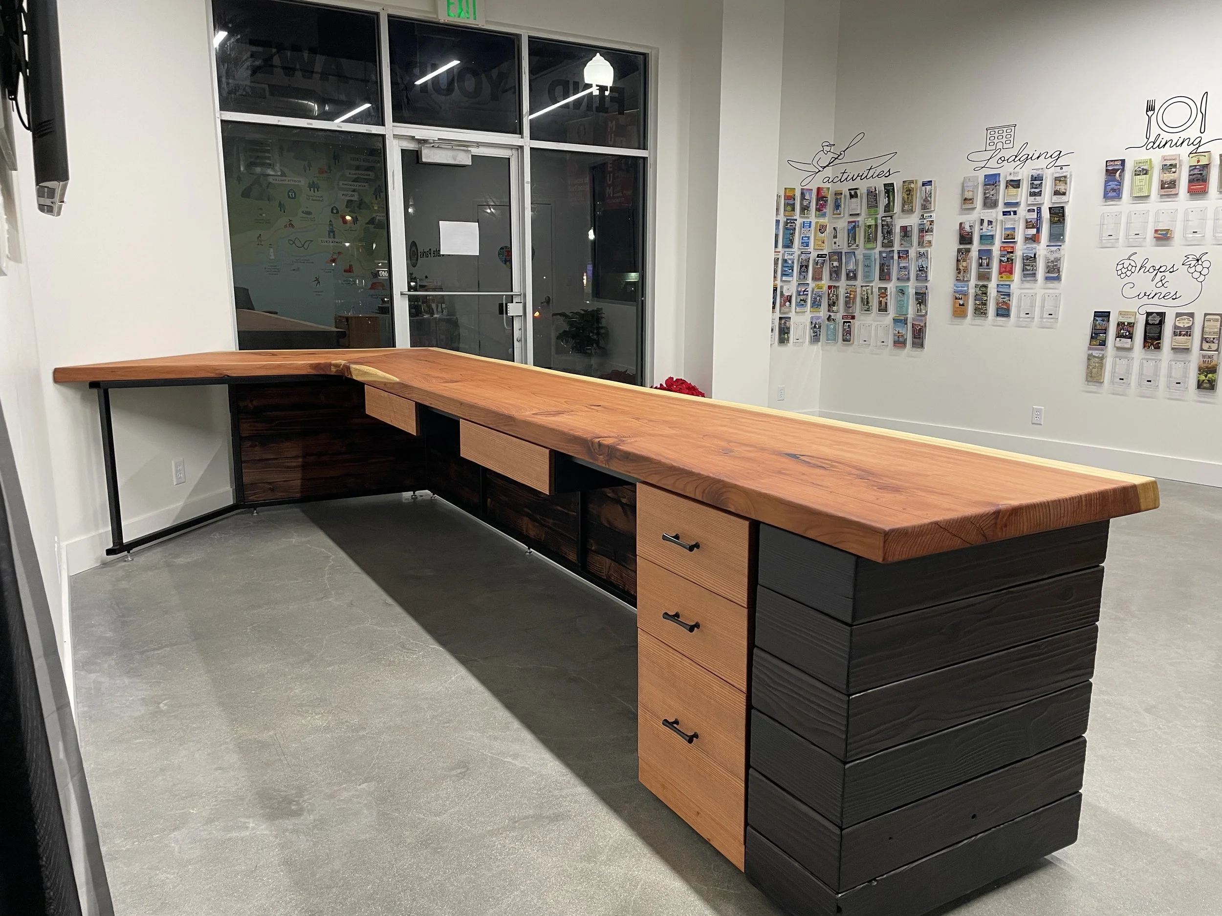 We flattened the slab on our slab flattener and cut out the sections we wanted to use. We hand-fabricated the steel framework for the desk, as well as the drawer system. Using an ancient wood-burning technique from Japan, known as Shou Sugi Ban, we blackened the Redwood forming the sides of the desk, bringing out the texture of the wood grain, and at the same time, protecting the wood from scratches in the high-traffic environment of this welcome center.